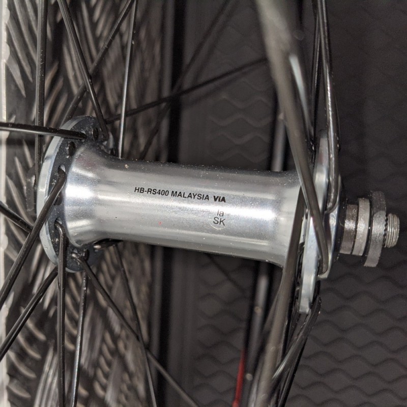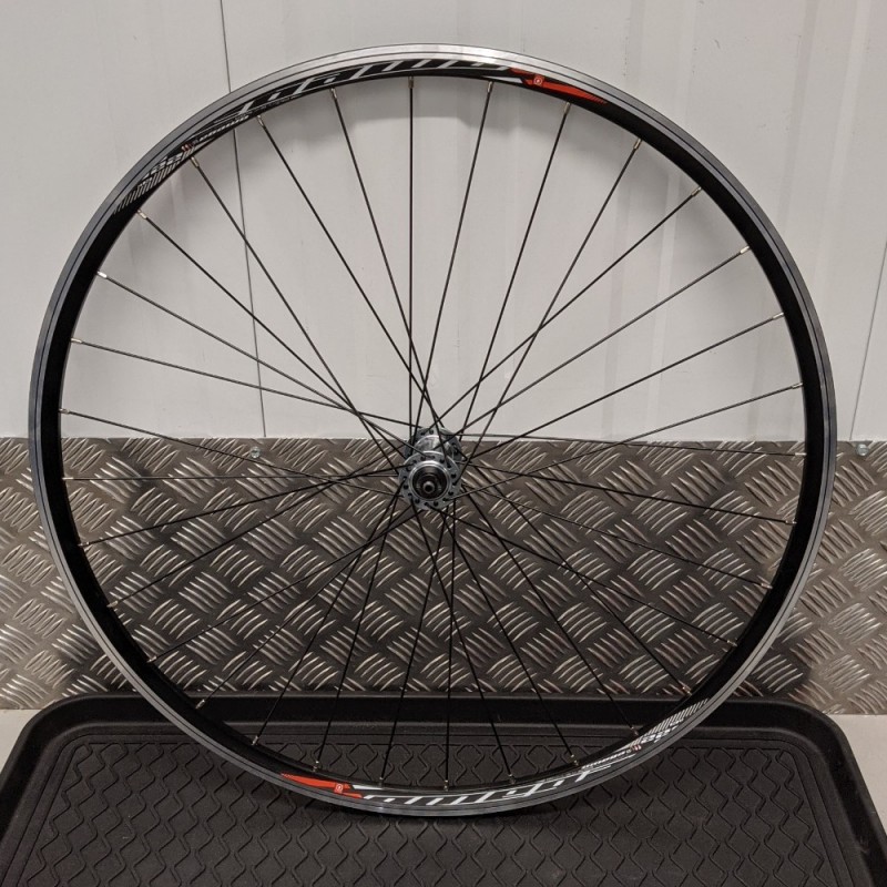 Front wheel, black, QR Shimano Tiagra hub on narrow section Mach1 Omega road specific rim. Replacement wheel for most road/racing bikes